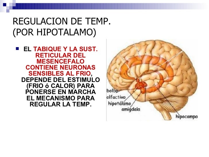 La temperatura corporal es mantenida por un sistema de regulación automático -un termostato- situado en el hipotálamo en la base del cerebro. Cómo bajamos la temperatura de nuestro cuerpo con el sudor. La regulación de la temperatura de un organismo depende de mecanismos de.