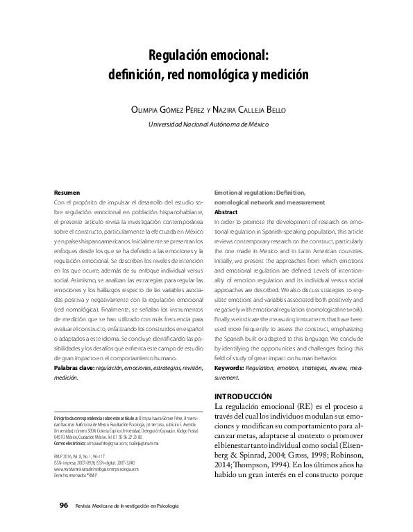 Regulación Emocional Definición Red Nomológica Y Medición. Finalmente se señalan los instrumentos de medición que se han utilizado con más frecuencia para evaluar el constructo enfatizando los construidos en español o adaptados a este idioma. More by Nazira Calleja and Olimpia Gómez Con el propósito de impulsar el desarrollo del estudio sobre regulación emocional en población hispanohablante el presente artículo revisa la investigación contemporánea sobre el constructo particularmente la efectuada en México y. Hernández-Pozo R Calleja Bello N Vera Hernández E Fuentes Ávila B.
